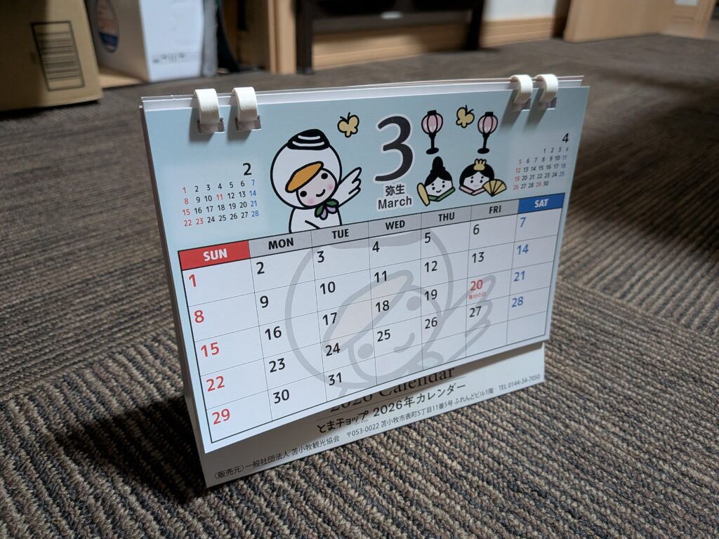 苫小牧観光協会 「とまチョップ」カレンダー 2026.03.262026.04.01 地元 苫小牧観光協会様のとまチョップカレンダーです。苫小牧駅前の観光案内所などで販売しております。お気になった方はぜひお手にお取りください。